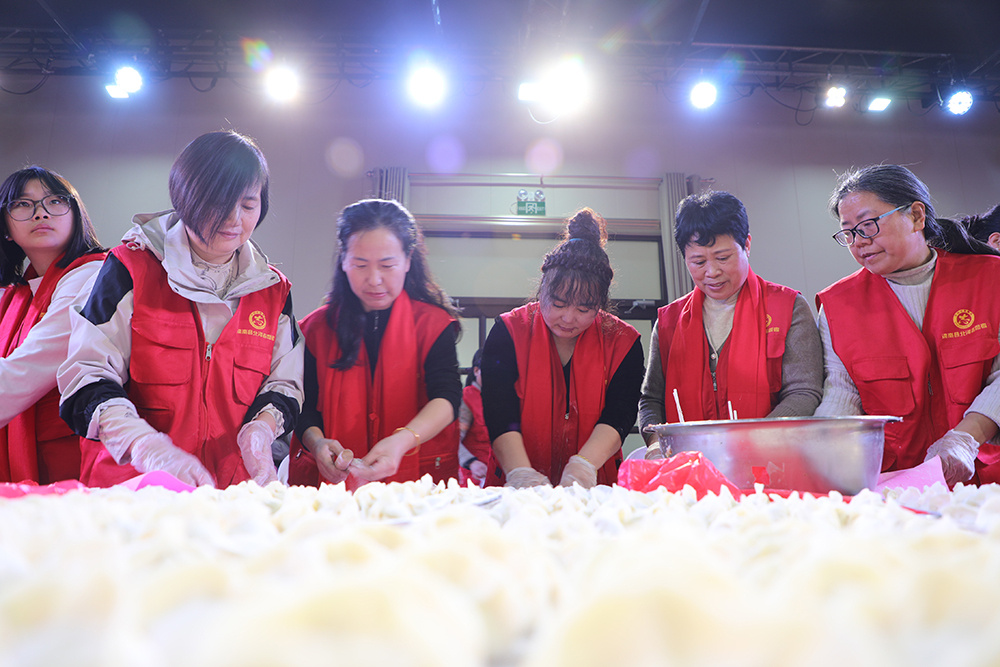 河北滦南北河志愿者正在包饺子。刘佳男摄