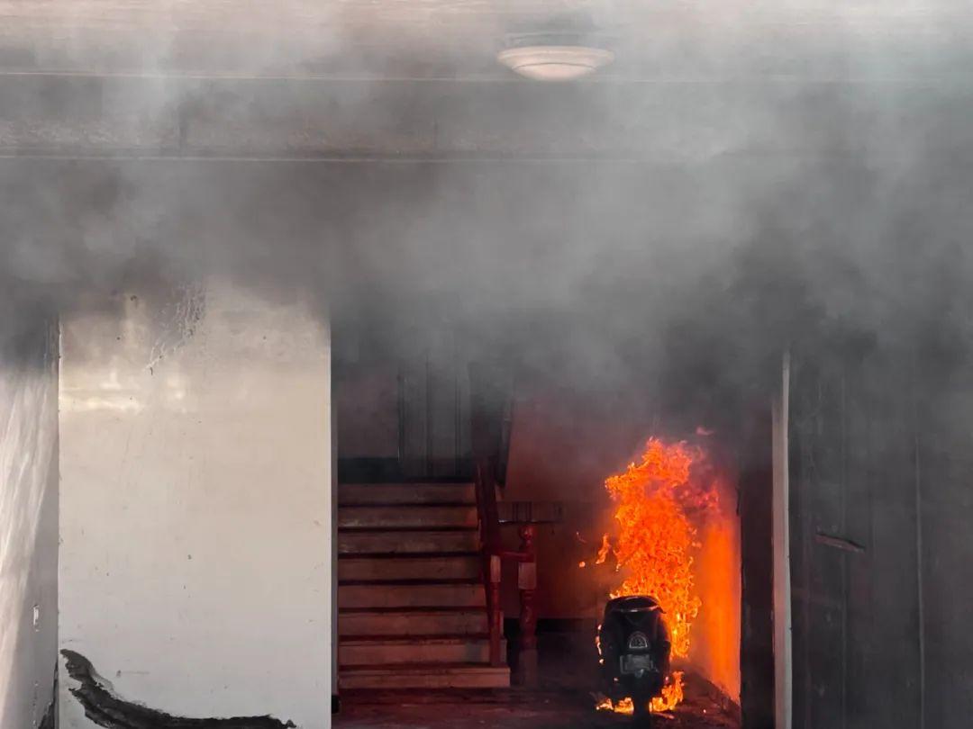 本次实验模拟的是停放在室内楼梯口的电动自行车,因锂电池过充发热导致故障而起火的情况。实验开始后,首先可以看到电池仓冒出黑烟,顷刻间火焰包裹车身,开始猛烈燃烧。
