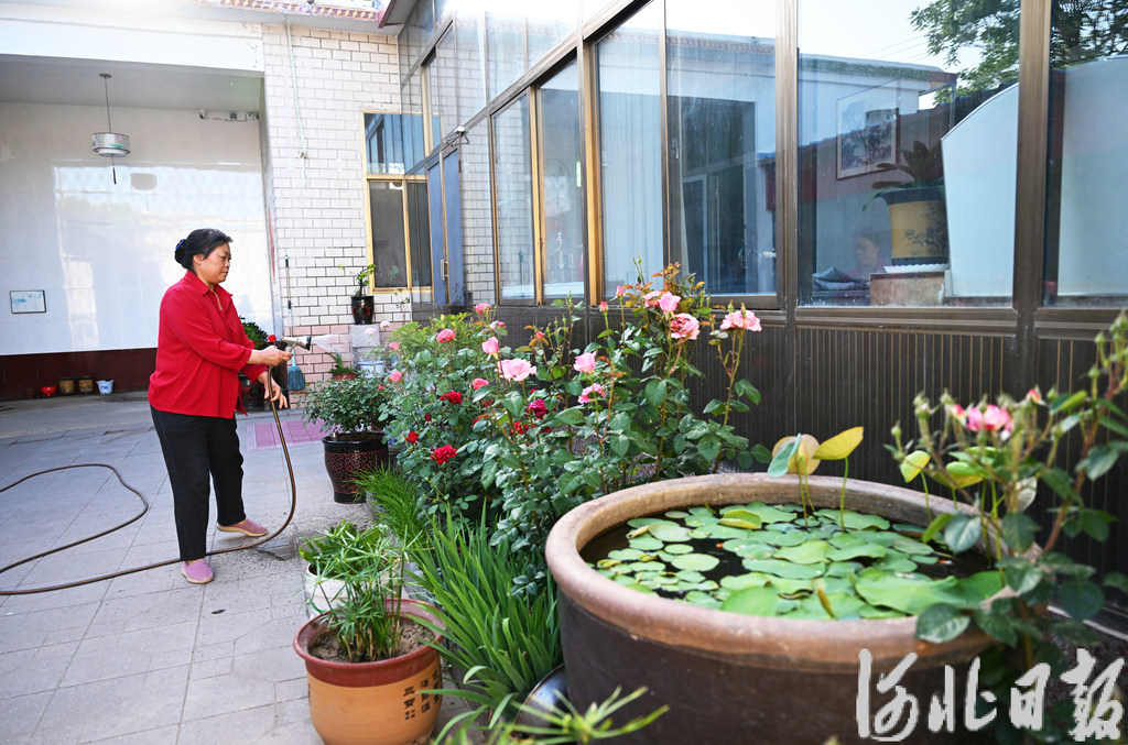 4月29日,宁晋县魏家庄村村民张春联在春意盎然的庭院里管护鲜花。河北日报记者 赵永辉摄