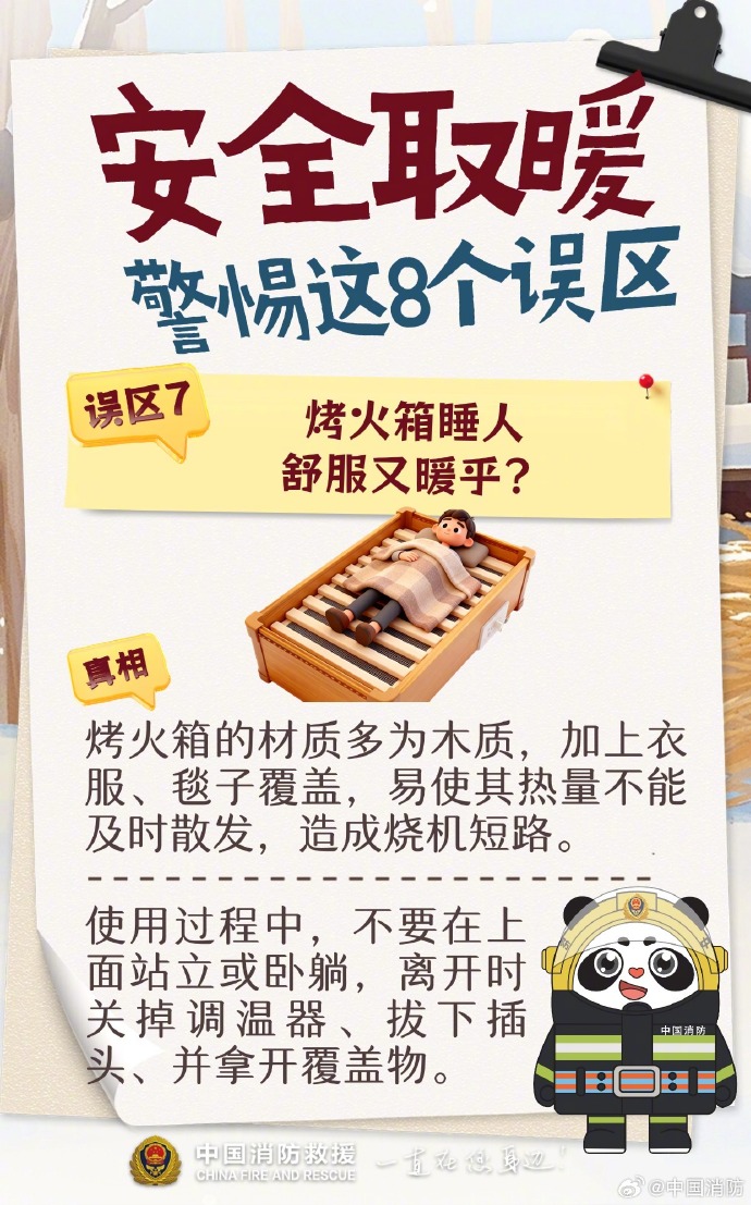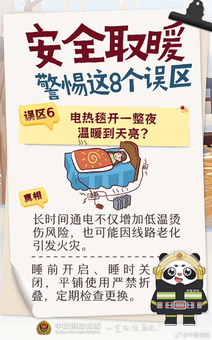 取暖器上搭湿衣、“小太阳”近距离烤物、电热毯开整夜不拔……这些看似省事的操作,实则非常不“省心”,甚至可能引发火灾!下面8个高频取暖误区,每种情况都坚决别有!快戳图对照整改,转发给家人朋友,一起守住取暖安全关~