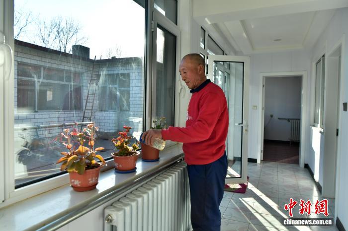2月10日,周家庄村村民蔡洪宽正在家中浇花。 中新网记者 翟羽佳 摄