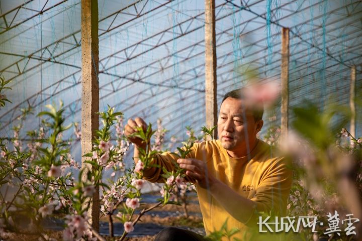 胡各庄镇西庄店村桃棚内农户正在查看桃树开花情况。赵江涛 摄